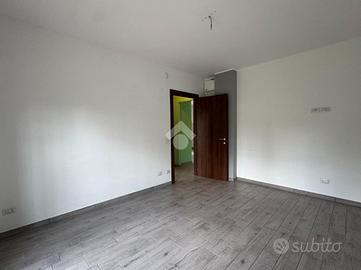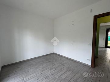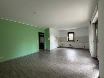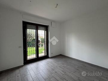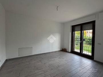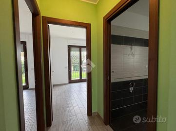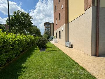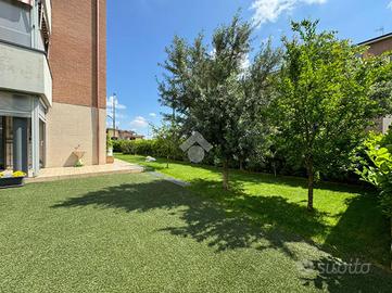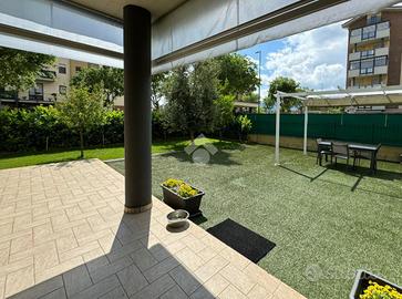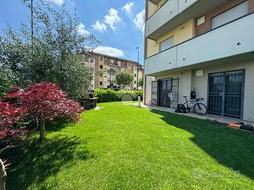 L'ingresso, tramite portoncino blindato, ci conduce alla zona giorno living con cucina lineare a vista. Lo spazio aperto è molto luminoso, grazie soprattutto all'ottima esposizione a sud e alla porta finestra che conduce al giardino privato dell'abitazione, che corre lungo tre lati dell'appartamento. Quest'area è anche dotata di climatizzatore.