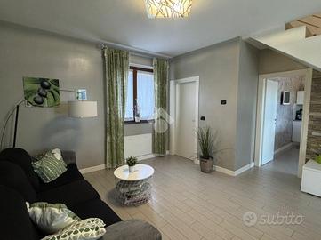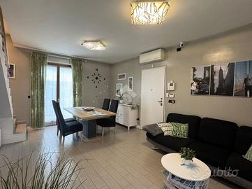 IMMOBILE IN TRATTATIVA-In contesto tranquillo e ben servito, proponiamo alloggio disposto su due livelli, costruito nel 2012. L'ingresso si apre su un luminoso soggiorno, separato dalla cucina abitabile; entrambi gli ambienti godono dell'accesso diretto al terrazzo, ideale per pranzi all'aperto e momenti di relax. Il disimpegno con angolo lavanderia, conduce al bagno principale finestrato, completo di doccia. Una comoda scala interna accompagna al piano mansardato, dove la zona notte offre una spaziosa camera matrimoniale con armadi a muro, una cameretta, un accogliente salottino e un secondo bagno con velux e vasca angolare, pensato per il massimo comfort. Completano la proprietà, al piano interrato, una cantina e un box auto doppio in lunghezza. Soluzione moderna, pronta da abitare, ideale per famiglie o coppie alla ricerca di spazi ben distribuiti in un contesto riservato e ben collegato.
