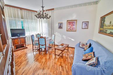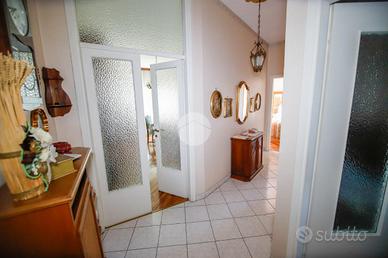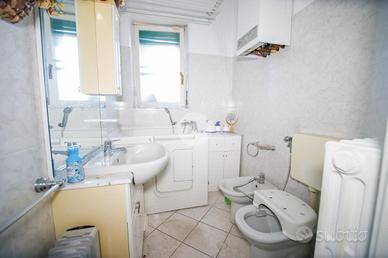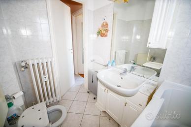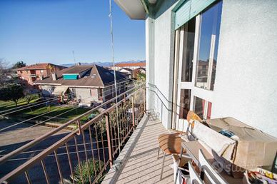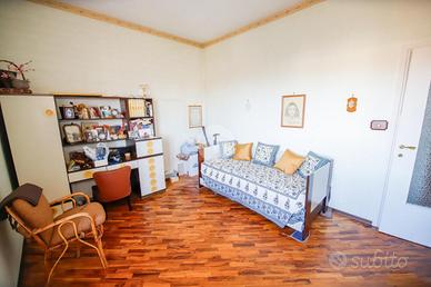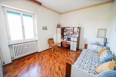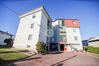 In piccola palazzina attorniata da cortile, suddiviso in piccoli orti e posti auto, e giardino condominiale, appartamento di generosa metratura al piano secondo. La zona giorno si articola di una pratica cucina abitabile e di un soggiorno. La zona notte, caratterizzata da pavimentazione in parquet, vanta una camera da letto matrimoniale con sfogo sul balcone ed una cameretta. Il bagno dotato di vasca gode di propria aria e luce. L' immobile si presenta in buono stato interno con infissi esterni in alluminio con doppi vetri ed è munito di valvole termostatiche. Il box auto interno cortile, adatto al ricovero di un autovettura, e la cantina sono a pertinenza della soluzione.