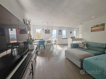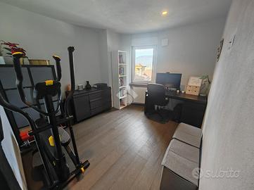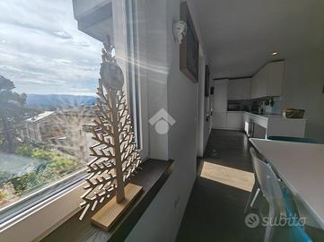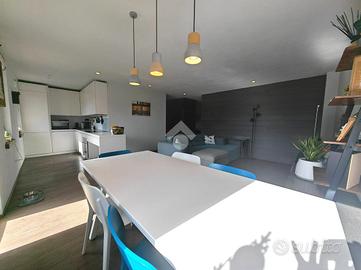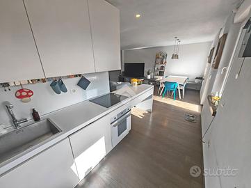 Appena entrati nell'appartamento veniamo accolti da un piccolo corridoio che ci accompagna alla spaziosa zona living dotata di angolo cottura con penisola ideale per la colazione o un pranzo veloce. La zona giorno è resa luminosa anche grazie alle tre grandi finestre e alla porta finestra che conduce al terrazzo esposto a sud. Predisposizione canna fumaria per eventuale caminetto o stufa.