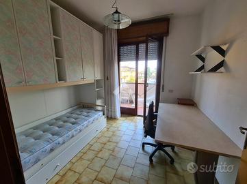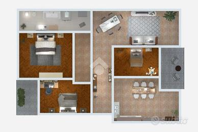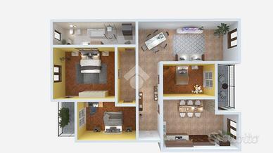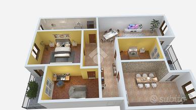 L'appartamento è così composto: ingresso in disimpegno, sulla destra troviamo la cucina abitabile con alte finestre ed accesso al primo balcone e la prima cameretta. Proseguendo dritto ci accoglie il soggiorno di ampie metrature. Alla sinistra del disimpegno accediamo alla zona notte dove troviamo, in ordine, la seconda cameretta con accesso al secondo balcone, la camera matrimoniale con anch'esso accesso esterno e il bagno finestrato sviluppato in lunghezza con box doccia e vasca da bagno.