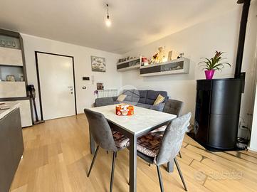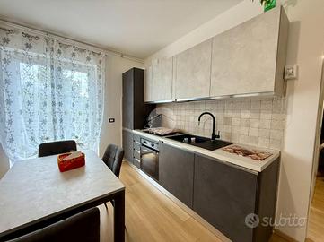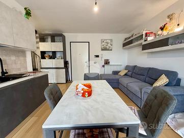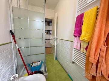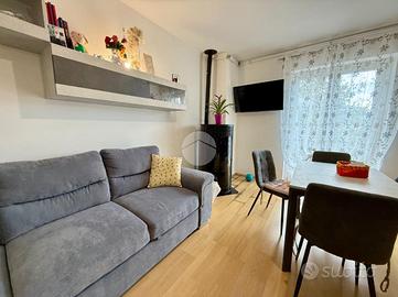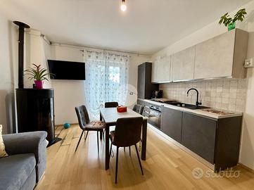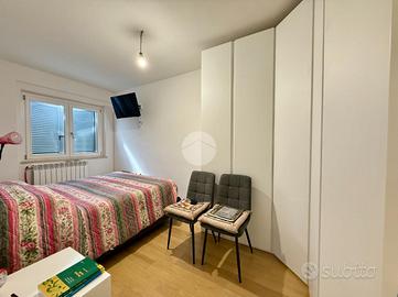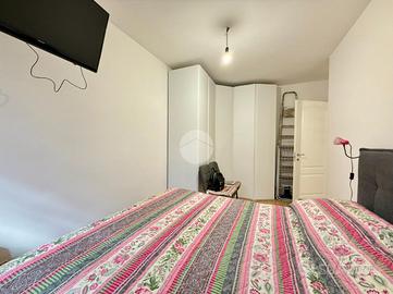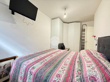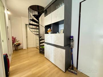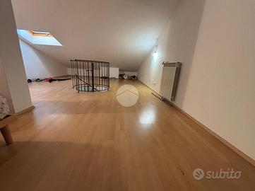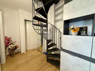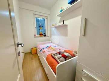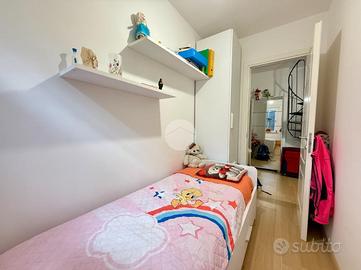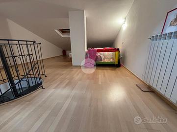 La soluzione è così disposta: entrando troviamo una zona giorno open-space con angolo cottura e affaccio su balcone panoramico, proseguendo una camera da letto matrimoniale, una cameretta singola e un bagno con doccia. Salendo al piano superiore mansardato troviamo ulteriore ampia camera da letto matrimoniale.
