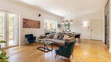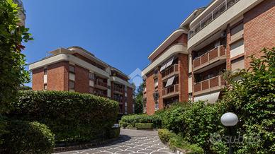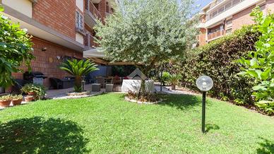 Via Vincenzo Ussani, proponiamo in un comprensorio con servizio di portineria e ampio spazio verde attrezzato per bambini, piano terra di recente ristrutturazione con rifiniture di pregio composto da: ingresso, salone doppio, cucina abitabile arredata, due camere matrimoniali, due bagni e 300 mq di giardino.