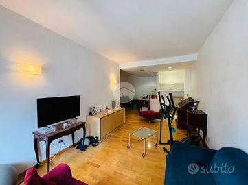 L'immobile è composto da un ampio soggiorno con tavolo da pranzo, un comodo divano e una zona per TV, luminoso con porta finestra che conduce al balcone principale dove troviamo un affaccio luminoso e tranquillo.