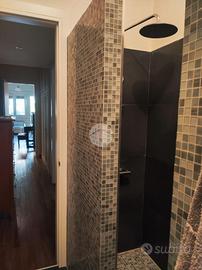 Subito a sinistra, la cucina abitabile e infine un bagno con doccia e finestra.
