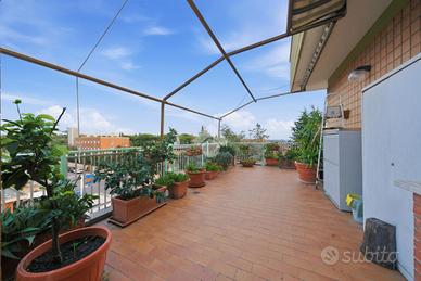 L'abitazione si sviluppa al quarto e quinto piano e si distingue per un'ottima distribuzione degli ambienti e per la presenza di ampi spazi esterni, pensati per valorizzare al massimo la vivibilità quotidiana. Il piano principale, posto al quarto livello, accoglie gli ospiti con un ingresso che introduce nella luminosa zona giorno, un ambiente elegante composto da un salone di rappresentanza reso arioso dalle aperture verso l'esterno e ideale per chi ama ricevere o vivere quotidianamente spazi ampi e confortevoli. Su questo stesso livello troviamo un bagno di servizio, funzionale e ben posizionato, e una comoda cucina abitabile con accesso diretto al primo terrazzo, caratterizzato da una doppia esposizione angolare che conferisce luce naturale durante tutto l'arco della giornata.