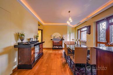 EUR CENTRO. Proponiamo in vendita un elegante appartamento situato all'interno di un prestigioso condominio immerso nel verde del parco condominiale, in una palazzina signorile di soli due livelli. La zona di rappresentanza si apre con un ampio ingresso, un raffinato salone e una confortevole area relax, impreziosita da una parete interamente vetrata che regala una splendida vista sul parco. La zona giorno comprende inoltre una cucina abitabile e un'area di servizio con lavanderia, studio e bagno. Un disimpegno circolare conduce alla zona notte, composta da due camere matrimoniali e doppi servizi. La suite padronale è arricchita da una cabina armadio e da bagno privato. L'appartamento dispone di tre balconi che garantiscono l'accesso all'esterno da ogni ambiente, con tripla esposizione che assicura riservatezza e tranquillità. L'immobile si presenta completamente ristrutturato con finiture di pregio ed è dotato di doppio ingresso, rendendo possibile una divisione in due unità abitative. Sono inoltre presenti impianto di climatizzazione canalizzato, sistema di allarme e riscaldamento autonomo. Completano la proprietà una comoda cantina e un posto auto all'interno dell'autorimessa condominiale. La posizione è particolarmente strategica: nelle immediate vicinanze del Laghetto dell'Eur, delle fermate metro Laurentina ed Eur Fermi, e circondato da esercizi commerciali di prima necessità. Un appartamento elegante, silenzioso e immerso nel verde, ideale per chi desidera vivere in un contesto esclusivo senza rinunciare alla comodità dei servizi.