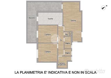 La disposizione interna comprende inoltre due bagni, una camera di servizio e un pratico ripostiglio che contribuisce a mantenere ordine e funzionalità.