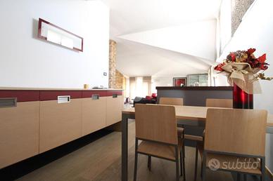 La zona giorno prosegue con una moderna cucina, dotata di angolo bar, con tavolo ideale per colazioni veloci o per intrattenere gli ospiti.