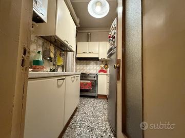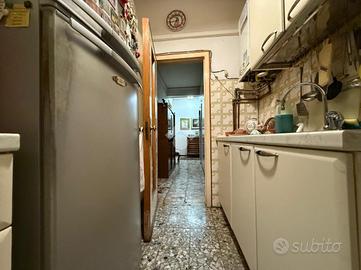 Varcata la porta d'ingresso ci accoglie un lungo corridoio che ci accompagna per tutto l'appartamento. Percorrendo quest'ultimo troviamo sulla sinistra rispettivamente la prima camera da letto, un bagno finestrato e la seconda camera da letto. Proseguiamo trovando un'ulteriore camera, una stanza adibita a soggiorno con sala da pranzo e a concludere un piccolo angolo cottura.