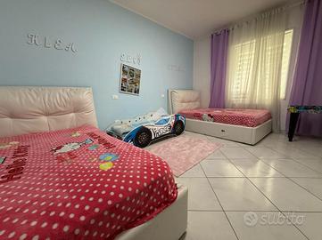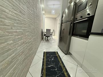 Varcata la porta d'ingresso ci accoglie un disimpegno che ci accompagna rispettivamente a destra alla prima camera matrimoniale , un bagno finestrato ,la seconda camera matrimoniale e la terza camera matrimoniale; mentre frontalmente all'ingresso troviamo un ampio soggiorno con accesso ad una cucina abitabile separata.