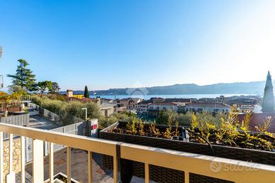 Gli interni si sviluppano in spazi ampi e luminosi. Il soggiorno, cuore della casa, dialoga con una cucina moderna separata da una raffinata porta scorrevole in vetro, creando un equilibrio perfetto tra convivialità e funzionalità. Dal living si accede al terrazzo, un vero e proprio prolungamento della zona giorno, protetto da tende da sole motorizzate e affacciato su una delle viste lago più suggestive del centro di Salò. Da qui, il lungolago è raggiungibile in soli cinque minuti a piedi, regalando la sensazione di vivere in un luogo privilegiato, dove tranquillità e bellezza si incontrano ogni giorno.
