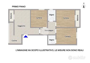 L'immobile si apre su una spaziosa zona giorno con angolo cottura separato; un comodo disimpegno conduce alla zona notte, composta da tre camere matrimoniali e due bagni con box doccia.