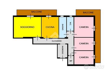 Accedendo dal portone, un comodo ingresso fa da barriera al corridoio che disimpegna le due aree ben distinte dell'appartamento, una asservita a zona-giorno e l'altra a zona-notte.