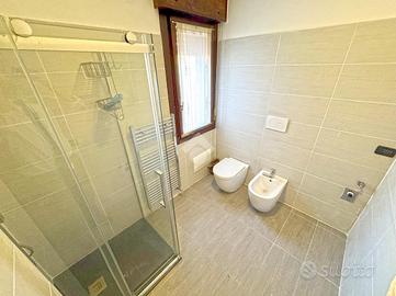 L'appartamento è dotato di impianto di climatizzazione, mentre al piano terra si trovano una cantina privata e un posto auto coperto, inclusi nella proprietà.
