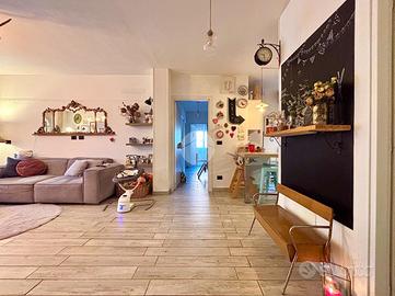 Dalla porta d'ingresso si accede direttamente alla luminosa zona giorno open space con angolo cottura, ambiente accogliente e ben distribuito, valorizzato dalla presenza di due terrazzi, uno con accesso dal soggiorno e uno dalla cucina. Nella zona giorno troviamo inoltre un bagno secondario dotato di area lavanderia e box doccia, caratterizzato da sanitari sospesi e finiture moderne.