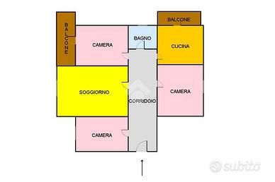 L'immobile si compone di ingresso su corridoio, una camera matrimoniale, due camerette, bagno finestrato, cucina abitabile e sala da pranzo, entrambe con accesso ai balconi. Completa la proprietà un ripostiglio sottotetto di pertinenza, situato all'ultimo piano dello stabile.