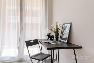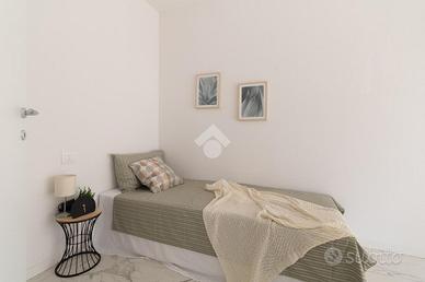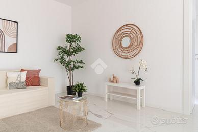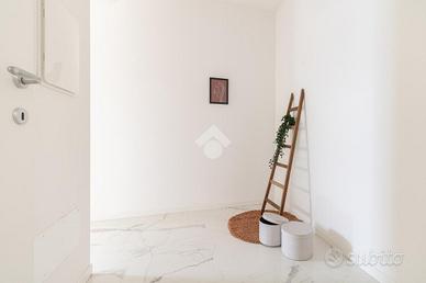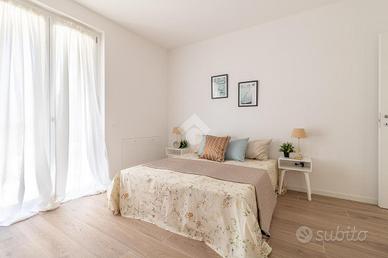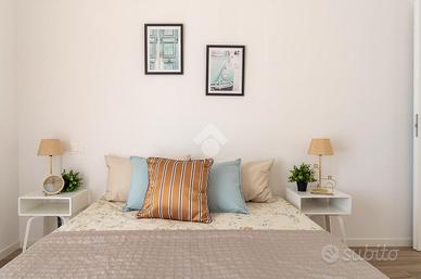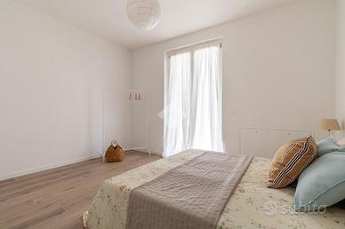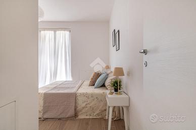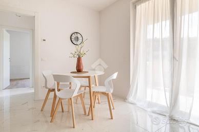 Entrando troviamo ad accoglierci un'ampia zona giorno, con accesso al primo balcone. Si passa poi verso sinistra attraverso un disimpegno che conduce alla prima camera matrimoniale con accesso al secondo balcone e un bagno finestrato.