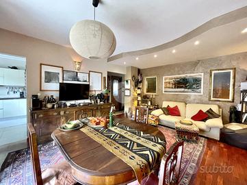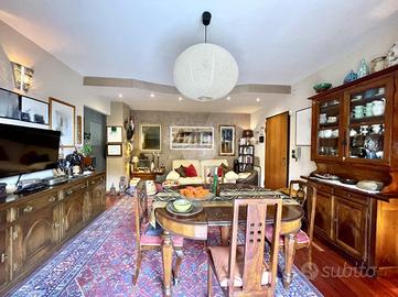 Ad esclusione dei bagni e della cucina, la pavimentazione unica dell'appartamento in parquet doussiè scuro dona eleganza, continuità e calore agli ambienti.