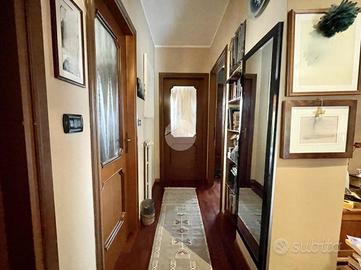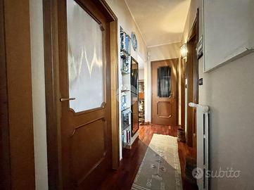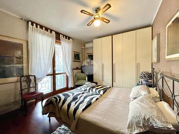 Attraverso il disimpegno raggiungiamo la camera matrimoniale, completa di climatizzatore con pompa di calore installato del 2025, e con accesso al secondo terrazzino affacciato sul retro della palazzina dotato di tende estive e invernali. La porta finestra d'accesso è inoltre dotata di inferriate di sicurezza.