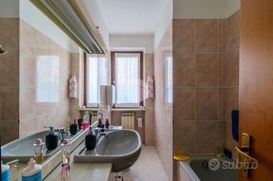 La zona notte comprende una camera matrimoniale e due camere singole di generosa metratura, adatte a diverse esigenze abitative. Sono presenti due bagni entrambi finestrati, di cui uno con vasca e uno con doccia, per garantire il massimo comfort. Un balcone, accessibile da una delle camere, aggiunge ulteriore spazio esterno.