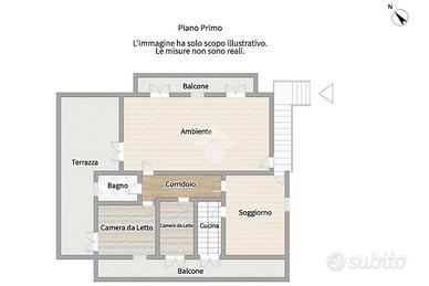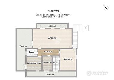 L'abitazione si raggiunge tramite una comoda scala esterna (visibile in foto) che conduce al primo piano. L'ingresso apre su un luminoso soggiorno con camino, collegato a una cucina abitabile con accesso diretto al balcone.