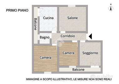La soluzione è composta da corridoio di ingresso, soggiorno spazioso, cucina abitabile con camino e balcone, tre camere matrimoniali di cui una attualmente adibita a salone ed una con accesso al balcone. Un bagno finestrato.