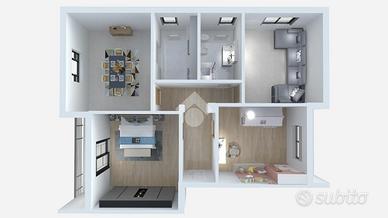 Gli infissi in PVC con doppio vetro assicurano un ottimo isolamento termico e acustico. Completano la proprietà una cantina, un box auto e due posti auto nel cortile dello stabile, offrendo soluzioni pratiche per il parcheggio.