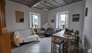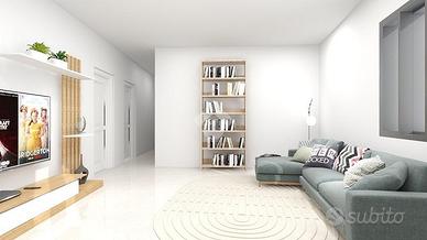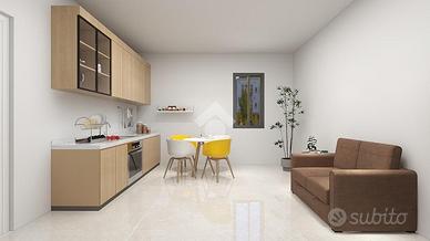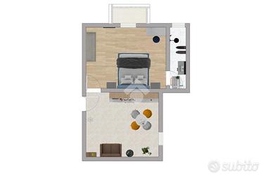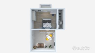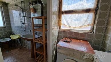 Bilocale composto da soggiorno, cucina abitabile, cameretta e bagno con doccia e finestra.