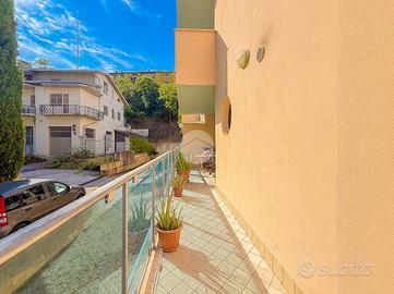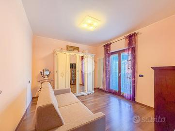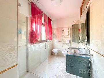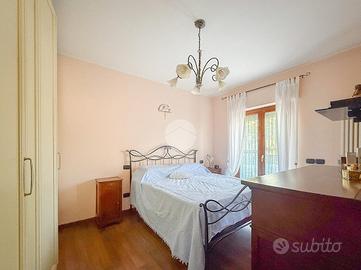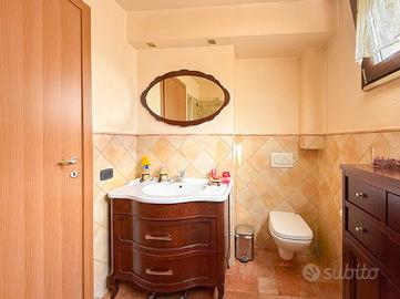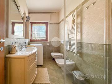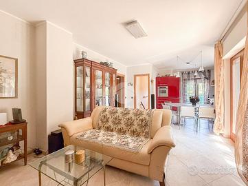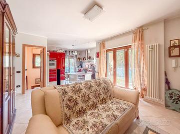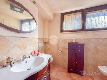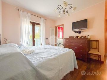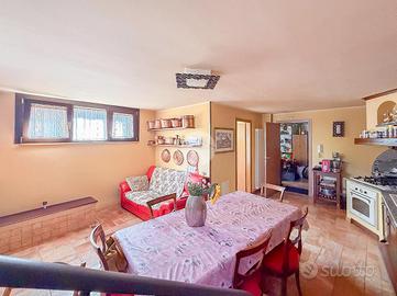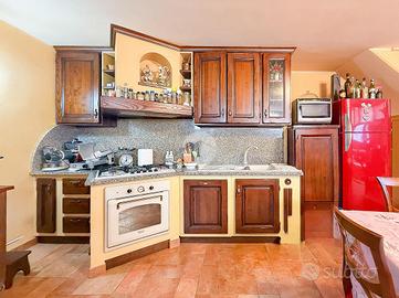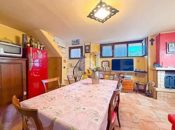 La soluzione è cosi composta: dal piano rialzato si accede al primo livello che ci conduce nella zona giorno con cucina e soggiorno open space, completa di balcone; un disimpegno ci accompagna nella zona notte dove troviamo due camere da letto, di cui una matrimoniale con bagno privato completo di box doccia e l'altra matrimoniale con finestra, a completare la zona notte un secondo bagno e un ripostiglio. Attraverso una gradinata in legno si accede al livello seminterrato dove troviamo un ambiente rustico con angolo cottura, e zona living completa di camino, un bagno con box doccia, ed infine box auto al piano.