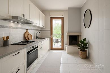 La cucina, separata e abitabile, conserva il fascino autentico del suo camino: un dettaglio che dà carattere e calore. Oggi è uno spazio da reinventare, ma con un tavolo in legno chiaro, sedie comode e una finestra che si apre sul terrazzo, potrebbe facilmente diventare il cuore della casa. Sul terrazzo, invece, è semplice immaginare un piccolo divano, qualche pianta e un tavolino, per creare un angolo riservato dove concedersi un momento di pausa sospeso sopra la città.
