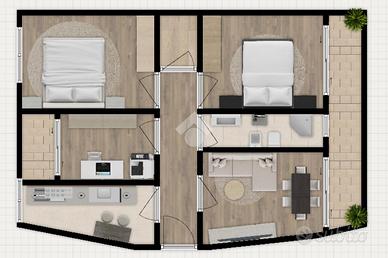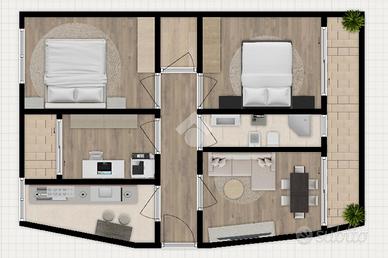 Varcando la soglia, un corridoio ampio accompagna verso gli ambienti principali della casa. La grande sala, illuminata dal sole del pomeriggio grazie all'esposizione sud-ovest, si apre sul terrazzo: uno spazio all'aperto dove iniziare la giornata con un caffè, accogliere gli amici o semplicemente lasciarsi scaldare dalla luce naturale. Accanto, la cucina abitabile è un ambiente vivo, ideale per chi ama cucinare e condividere, arricchito da un balcone che regala respiro e praticità.