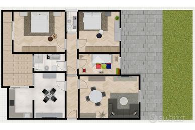 Varcata la porta d'ingresso si entra subito in uno spazio ampio e luminoso, che si apre verso il giardino privato, facilmente accessibile e ideale per vivere all'aperto ogni giorno, tra pranzi, momenti di relax e giornate in compagnia. La cucina, separata ma vicina alla zona living, è organizzata in modo funzionale con area cottura e zona pranzo, e comunica con un terrazzo verandato perfetto come lavanderia e spazio di servizio.
