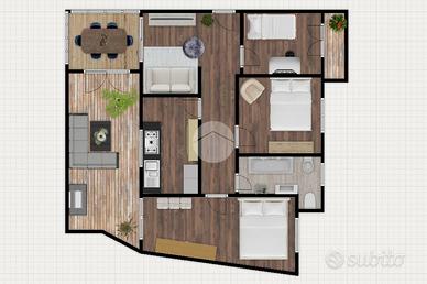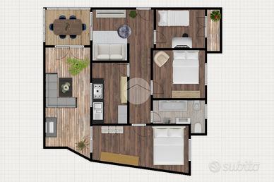 La zona giorno offre un salone che da accesso ad un ampio terrazzo abitabile di 40 mq ad una cucina abitabile con camino. La zona notte comprende una spaziosa camera da letto matrimoniale e 2 camere da letto singola. Inoltre, è incluso anche un posto auto con cancello elettrico.