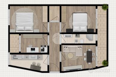 Varcando la soglia, un corridoio ampio accompagna verso gli ambienti principali della casa. La grande sala, illuminata dal sole del pomeriggio grazie all'esposizione sud-ovest, si apre sul terrazzo: uno spazio all'aperto dove iniziare la giornata con un caffè, accogliere gli amici o semplicemente lasciarsi scaldare dalla luce naturale. Accanto, la cucina abitabile è un ambiente vivo, ideale per chi ama cucinare e condividere, arricchito da un balcone che regala respiro e praticità.