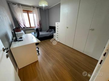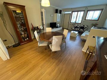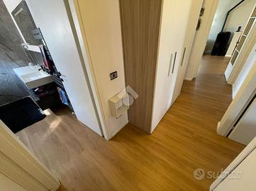 Salone a vista con cucina abitabile adiacente, corridoio, tre camere da letto, due bagni, di cui uno all'interno della camera padronale.