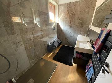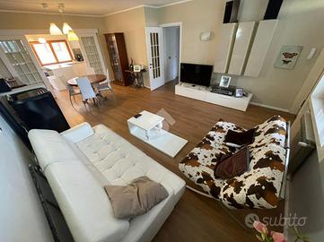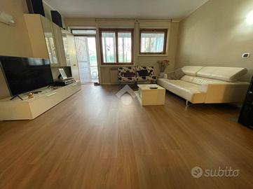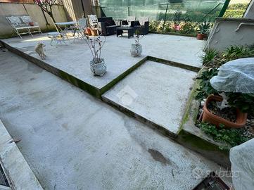 Tramite un balcone coperto, si accede al giardino privato, pavimentato, di c.a 100 mq.
