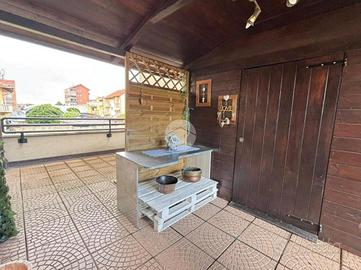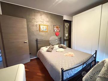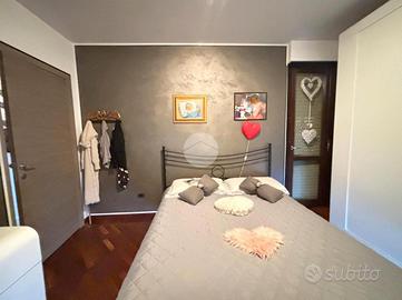 La zona notte include una cameretta con balcone alla francese e una spaziosa camera matrimoniale, caratterizzata dal parquet e dotata di accesso a un generoso terrazzo di circa 30 mq, parzialmente coperto da una tettoia, ideale per pranzi all'aperto o per creare una zona relax.