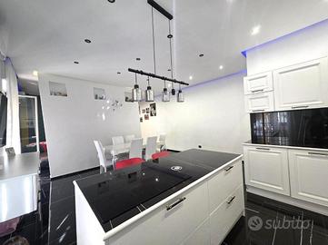 L'ingresso si apre su un'ampia zona giorno moderna e accogliente, dove una parete divide con equilibrio il soggiorno, arredato con area divani e TV, dalla cucina con isola centrale e tavolo da pranzo.