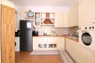 La zona notte si compone invece di ben tre camere da letto, di cui una matrimoniale e due singole. A servizio dell'intero alloggio è presente un bagno con doccia ed un ripostiglio/lavanderia.