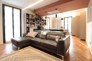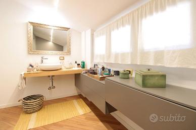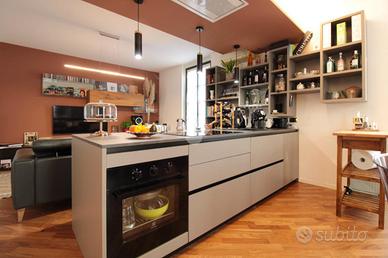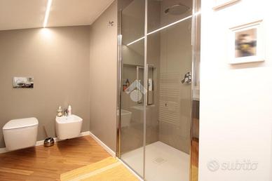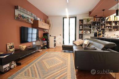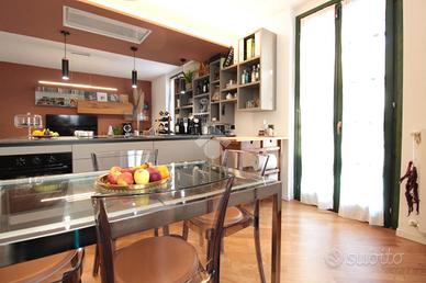 L'abitazione si sviluppa su due livelli così composti. L'ingresso, che funge anche da area pranzo con affaccio sul cortile condominiale, conduce all'ampia zona giorno open-space con cucina a vista ed affaccio sul terrazzo privato di oltre 25 mq. Oltre disimpegno che conduce al primo bagno di servizio con doccia.