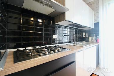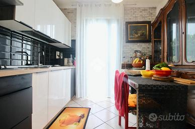 Un corridoio d'ingresso conduce alla cucina abitabile e al soggiorno, entrambi impreziositi da un terrazzo comune con affaccio sul verde.