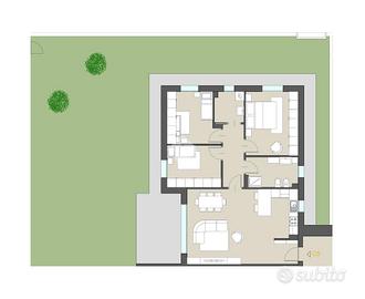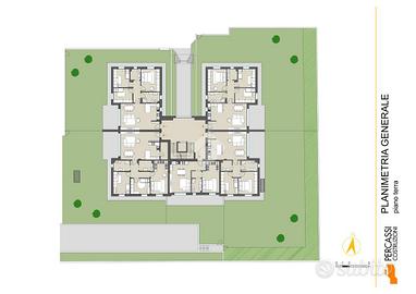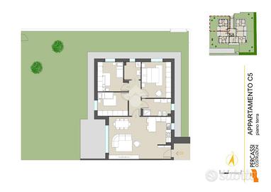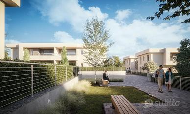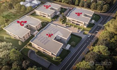 E' un quadrilocale con giardino privato, libero su tre lati, con ingresso in una spaziosa e luminosa zona giorno open-space con cucina a vista ed uscita su portico coperto e giardino. Ha tre camere da letto e due servizi entrambi finestrati.