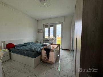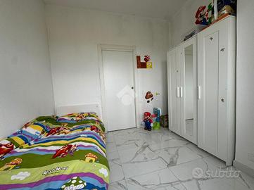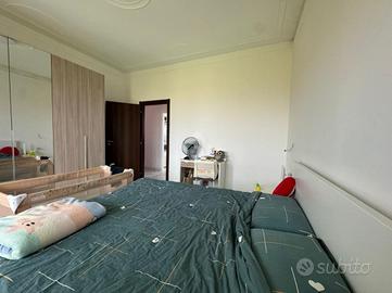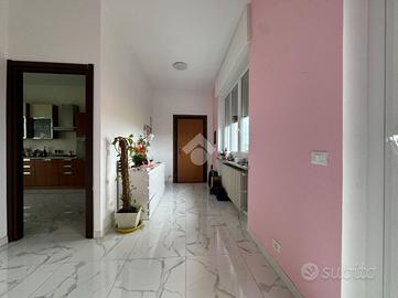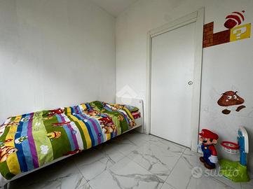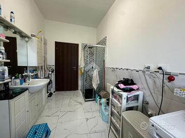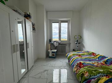 Proseguendo lungo il corridoio, ci accoglie un bagno moderno e luminoso con doccia, seguito da una prima camera matrimoniale, ampia e versatile: qui, se desiderato, è possibile abbattere una parete per creare un open-space con cucina a vista, trasformando l'ambiente in un moderno living di grande impatto.
