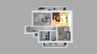 La casa si sviluppa in ingresso, cucina abitabile servita da balcone, ampio e luminoso salone affacciato sul secondo balcone e ripostiglio; passando nella zona notte troviamo le due camere da letto, di cui una matrimoniale e una doppia ed infine un bagno finestrato con vasca.