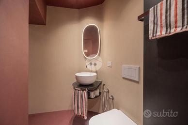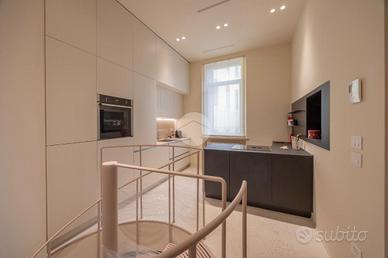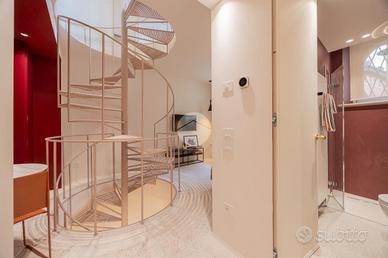 Per un totale di 135 mq., l'immobile si sviluppa su più livelli e vanta la possibilità di essere sfruttato come unica o come doppia unità, godendo di due distinti ingressi indipendenti. Al piano primo l'unità principale, composta di un ampio soggiorno con pavimento in parquet originale, impreziosito da un arredo minimal ed elegante, come il divano di Carlo Scarpa ed Arco Led Floor di Flos, un camino ed un balcone abitabile; segue poi una suite con cabina armadio e zona lettura, ed una cucina abitabile ed un secondo servizio. Da questa, tramite una scala a chiocciola di design, è possibile accedere al piano terra, dove si trova la seconda unità, composta di un monolocale con seconda cucina, servizio finestrato con box doccia e zona lavanderia. L'immobile, accessoriato di domotica, presenta il sistema d'allarme e di video sorveglianza.