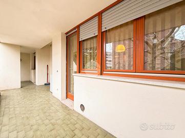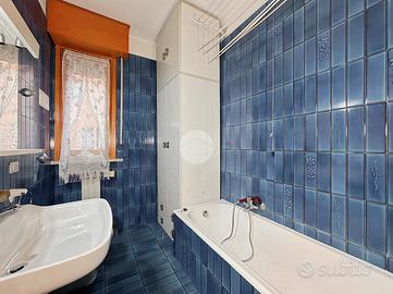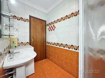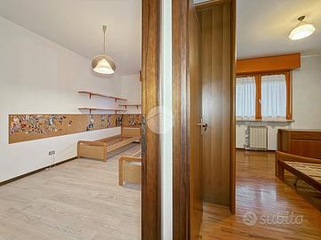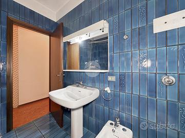 All'interno, l'appartamento conserva le finiture originali degli anni Ottanta, offrendo così ampie possibilità di personalizzazione secondo il proprio gusto e le proprie esigenze. L'ingresso si apre su un comodo disimpegno che conduce, sulla destra, a una camera da letto con uscita diretta sul giardino e a un pratico ripostiglio. Proseguendo si accede al luminoso soggiorno con cucina open space, un ambiente accogliente e ben esposto, affacciato sul balcone e sul giardino di pertinenza. La zona notte è completata da due bagni finestrati, uno dotato di vasca e l'altro di doccia, oltre a una camera singola e a una spaziosa camera matrimoniale.