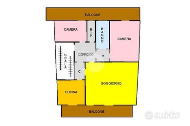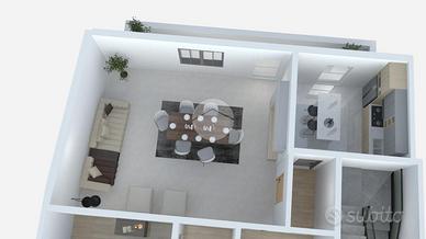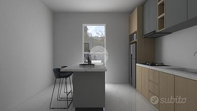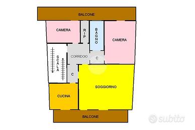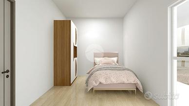 L'appartamento gode di doppia esposizione parallela e si articola intorno a un ingresso su disimpegno che collega tutte le camere. Sul lato sinistro si trovano la cameretta, il ripostiglio, il bagno con doccia e la camera da letto. Sul lato destro, invece, ci sono il soggiorno doppio con accesso sia dal disimpegno che dalla cucina semi-abitabile.