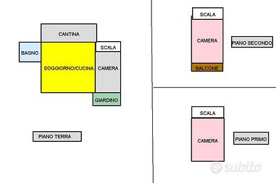 L'abitazione presenta al piano terreno l'ampia cucina, la prima camera, la cantina ed il bagno, non collegato internamente agli altri ambienti; le rimanenti due camere da letto sono situate una al piano primo ed una al piano secondo, entrambe sono collegate internamente dalla scala interna.