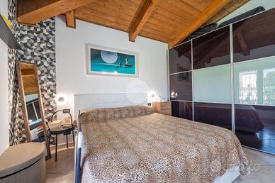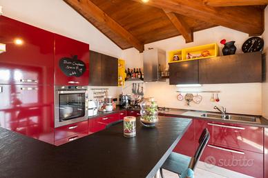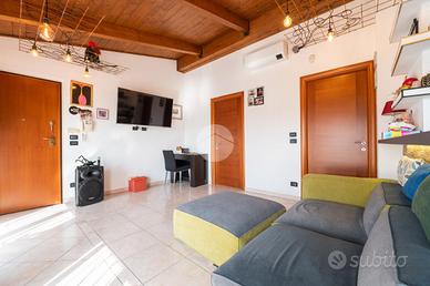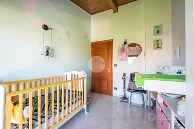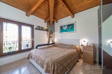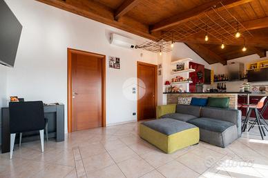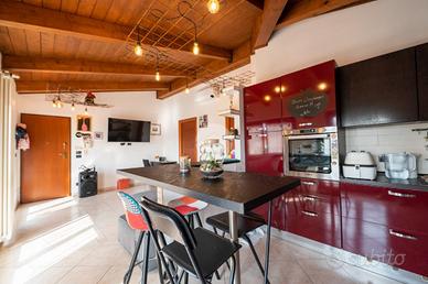 Volvera. In zona centrale, comoda a tutti i principali servizi, l'appartamento si trova al secondo ed ultimo piano di una palazzina in paramano misto intonaco del 2006.Dall'ingresso si accede direttamente sulla zona giorno living con cucina a vista. Da tale ambiente si ha sfogo sul balcone.La zona notte è composta da due camere da letto, di cui una matrimoniale. Il bagno è finestrato e dotato sia di vasca da bagno che di doccia.L'immobile, reso suggestivo dal tetto in legno con travi a vista, gode di una doppia esposizione. Il riscaldamento è autonomo. Gli infissi sono in legno con doppio vetro e sono ovunque presenti le zanzariere. L'immobile è inoltre previsto di predisposizione per l'impianto di condizionamento sia nella zona giorno che nella zona notte e dell'impianto antifurto. Completano la proprietà un ripostiglio sito nel vano scale e il box auto singolo.